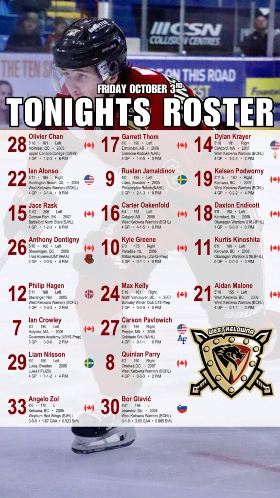 Kelsen Podworny gave the Warriors a 4-0 lead at 18:18 of the first period. The assists on the goal went to Ian Alonso and Lulea, Sweden native Ruslan Jamaldinov. Jamldinov is one of 2 players on the Warriors from Lulea, Sweden. The other Swede however has a more Swedish sounding name. This was the only goal they scored in the first period that was a garbage goal, The rest were all very nice.