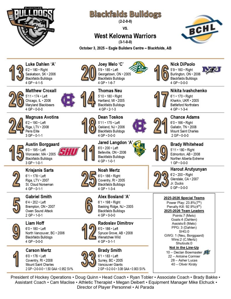 Bulldogs next game is Saturday October 4th against the Spruce Grove Saints in Blackfalds