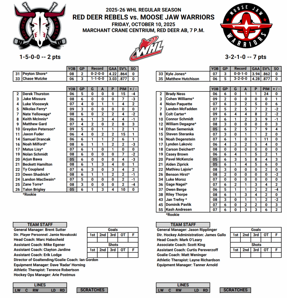 On Friday night, the Marchant Crane Centrium was electric as the Red Deer Rebels clashed with the Moose Jaw Warriors in a thrilling, high-octane showdown, ultimately ending in a 6-4 defeat for the home team.The Rebels showcased their veteran grit, with Talon Brigley, Matthew Gard, Jaxon Fuder, and Beckett Hamilton lighting the lamp to fuel a spirited performance, even though the scoreboard didn’t reflect their effort.The Warriors improved their record to 4-2-1-0, while the Rebels fell to 1-6-0-0, marking their fourth consecutive loss.