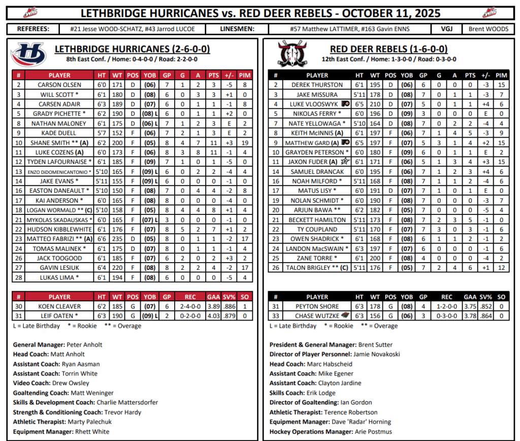 It looks like it is going to be a long season for the Lethbridge Hurricanes. πŸ™„ The Rebels looked great tonight no question about it. Were they good because they are actually playing good or because they played a Lethbridge Team that played absolutely horrible? The Rebels came out strong from the opening shift and controlled things from start to finish in a 5-0 win over the Lethbridge Hurricanes at the VisitLethbridge.com Arena. Red Deer snapped its four-game losing streak and handed Lethbridge it’s fifth-straight home loss.