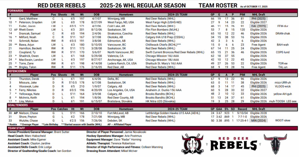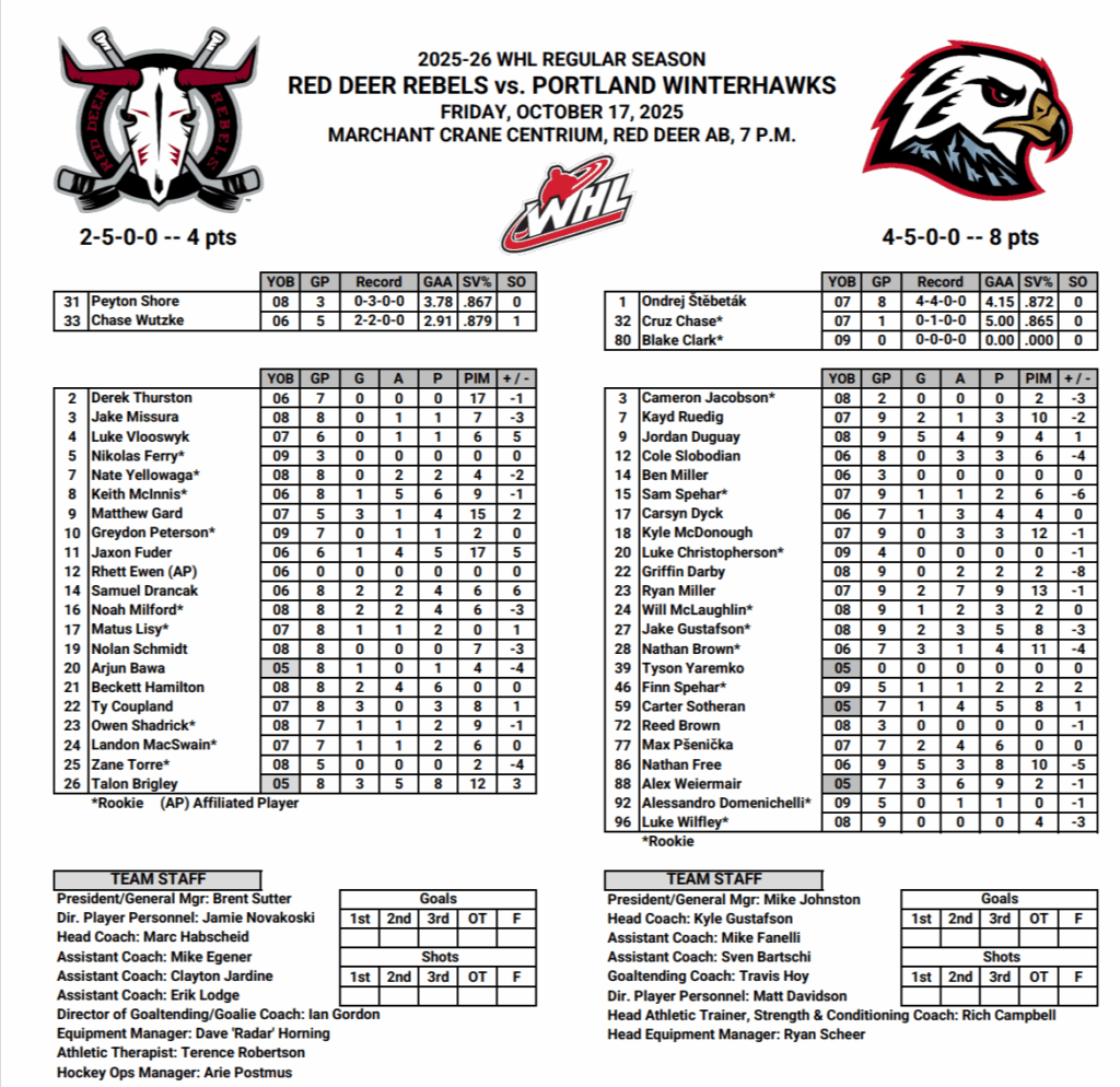 The Red Deer Rebels put up a gritty fight, hanging tough against the Portland Winterhawks right up to the dying seconds, even if it wasn’t their sharpest night on the ice. But then came the heartbreak: Portland slipped in a late dagger of a goal, followed by an empty-net insurance tally, to snatch a shocking 3-1 victory at the Marchant Crane Centrium. Rebels netminder Chase Wutzke was a brick wall, stopping 25 of 28 shots, and Landon MacSwain chipped in his second goal in as many outings. Over in the Portland crease, Ondrej Stebetak was lights-out, denying 30 Rebel attempts.