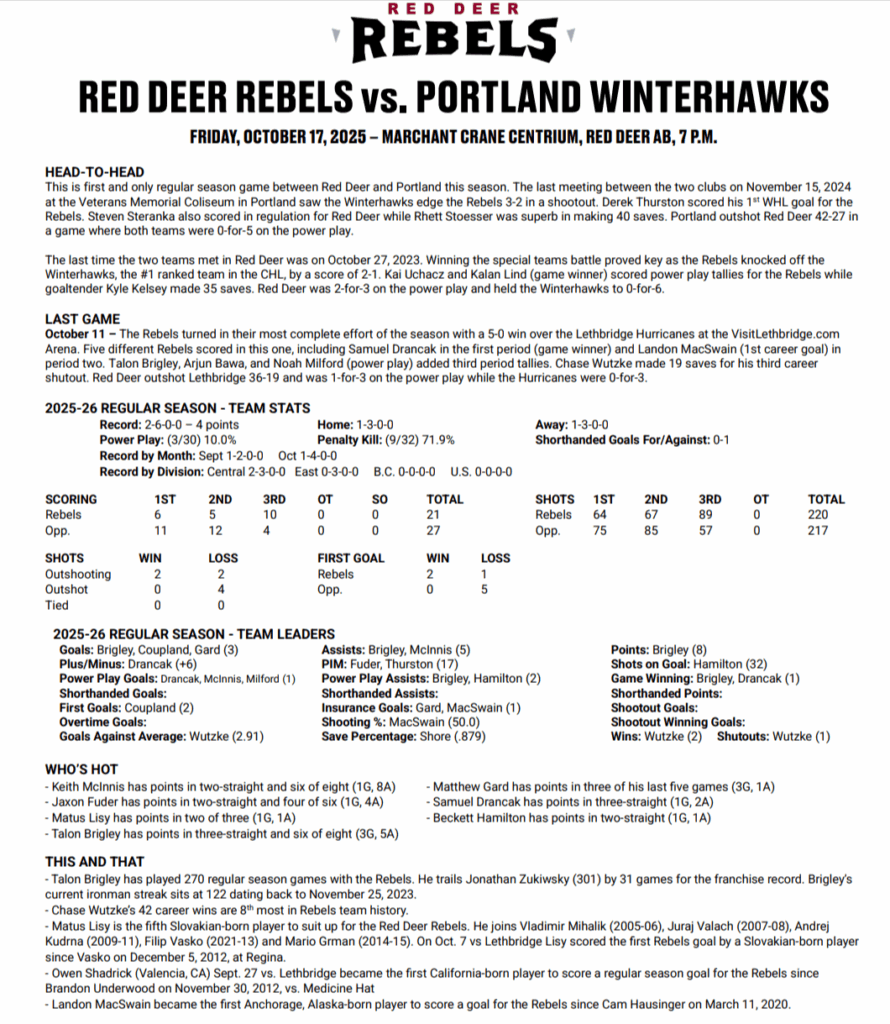Rebels next game is Saturday October 18th in Red Deer against the Spokane Chiefs