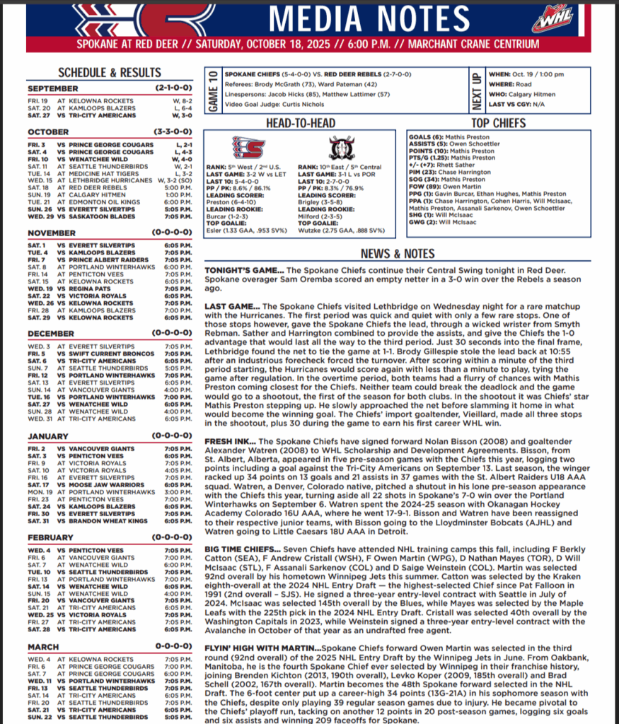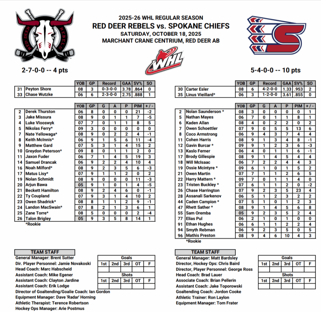 The Red Deer Rebels brought fresh fire and desperation to their matchup with the Spokane Chiefs, but came up agonizingly short in a 3-2 defeat on Saturday evening at the Centrium. Landon MacSwain kept his scoring streak alive, ripping home a power-play marker for his third goal over the last three outings, and captain Talon Brigley capped things off with a late strike in the dying moments—his milestone 100th point in the WHL.