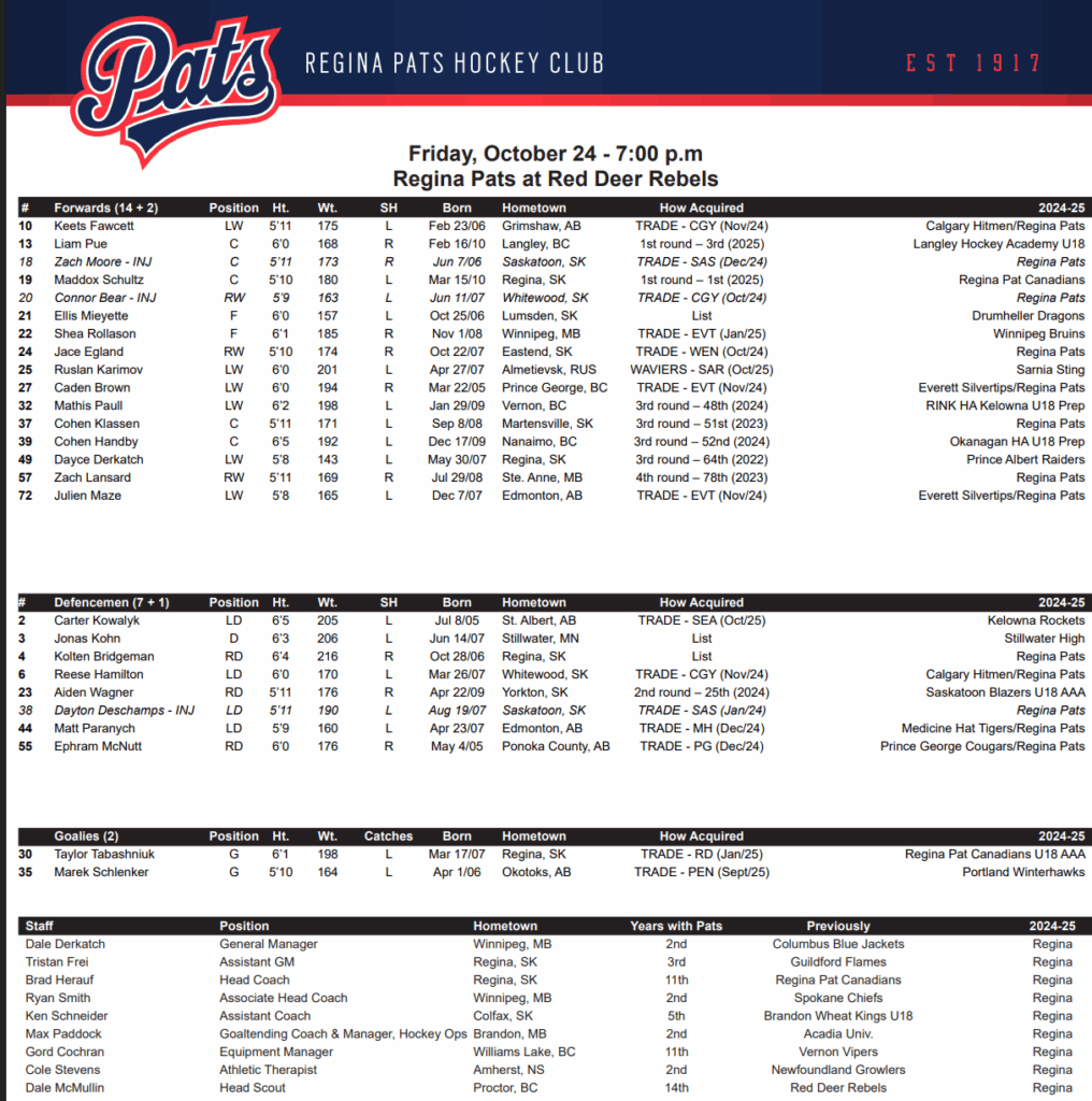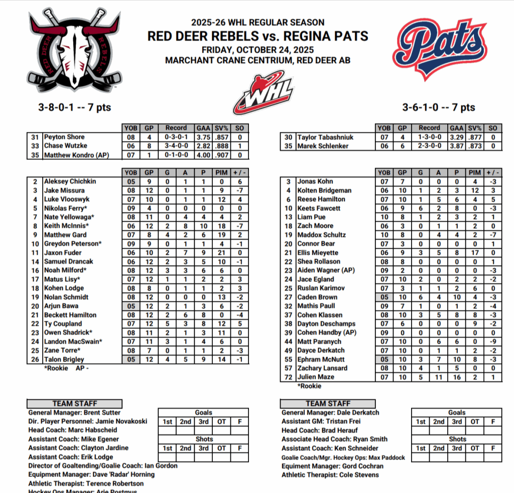 Following a midweek road swing through Saskatchewan where they snagged three of four available points, the Rebels came back to their home rink on Friday for a showdown with the Regina Pats. Standout multi-point efforts from Beckett Hamilton, Matthew Gard, Landon MacSwain, and Talon Brigley propelled the Rebels to a convincing 5-2 win against the Pats. Matthew Kondro, the goaltender recently called up from Lloydminster in the AJHL, stepped in before puck drop and stopped 25 shots to notch his maiden WHL victory. The Rebels’ special teams shone brightly in the matchup, converting 2 of 3 power-play chances while limiting the Pats to just 1 success on their 4 attempts.