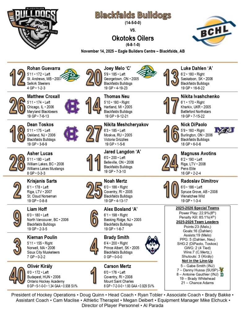 Head-to-Head Games Since Both Teams Joined the BCHL (February 2024 Onward)Both the Okotoks Oilers and Blackfalds Bulldogs joined the BCHL effective February 1, 2024 (midway through the 2023-24 season). Below is a complete list of all regular-season games between them since then, including dates, locations, final scores, and outcome details (e.g., regulation, OT, or shootout). Games are listed chronologically. Note: One scheduled game on November 24, 2024, was postponed (PPD) and not rescheduled as of November 15, 2025.
