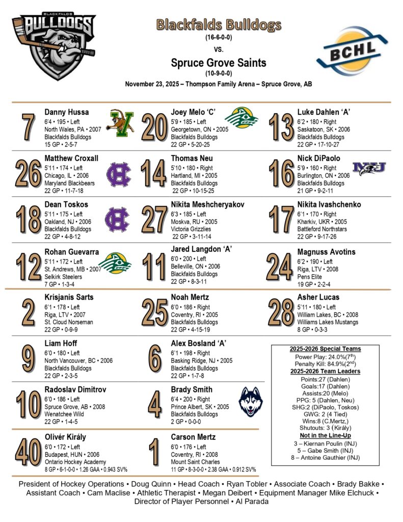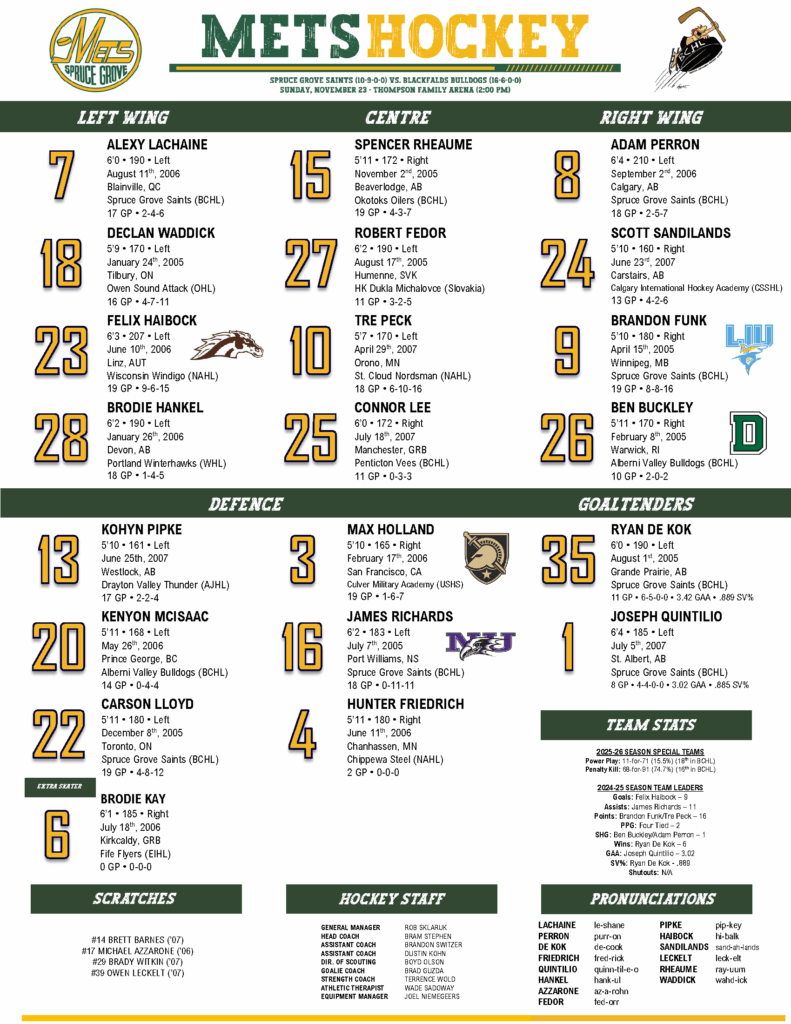 The Bulldogs beat the Saints 4-3 in Overtime on Sunday their first overtime game of the season. On Flo tv Scott Stinson was joined by Chex who announces the goals at the home games. He did a great job hope they use him again. The Spruce Grove Saints dug deep into the archives, dusting off their classic 1975 Spruce Grove Mets jerseys for a retro night. They came out buzzing with energy, but ultimately fell just short, dropping a 4-3 overtime decision to the Blackfalds Bulldogs.