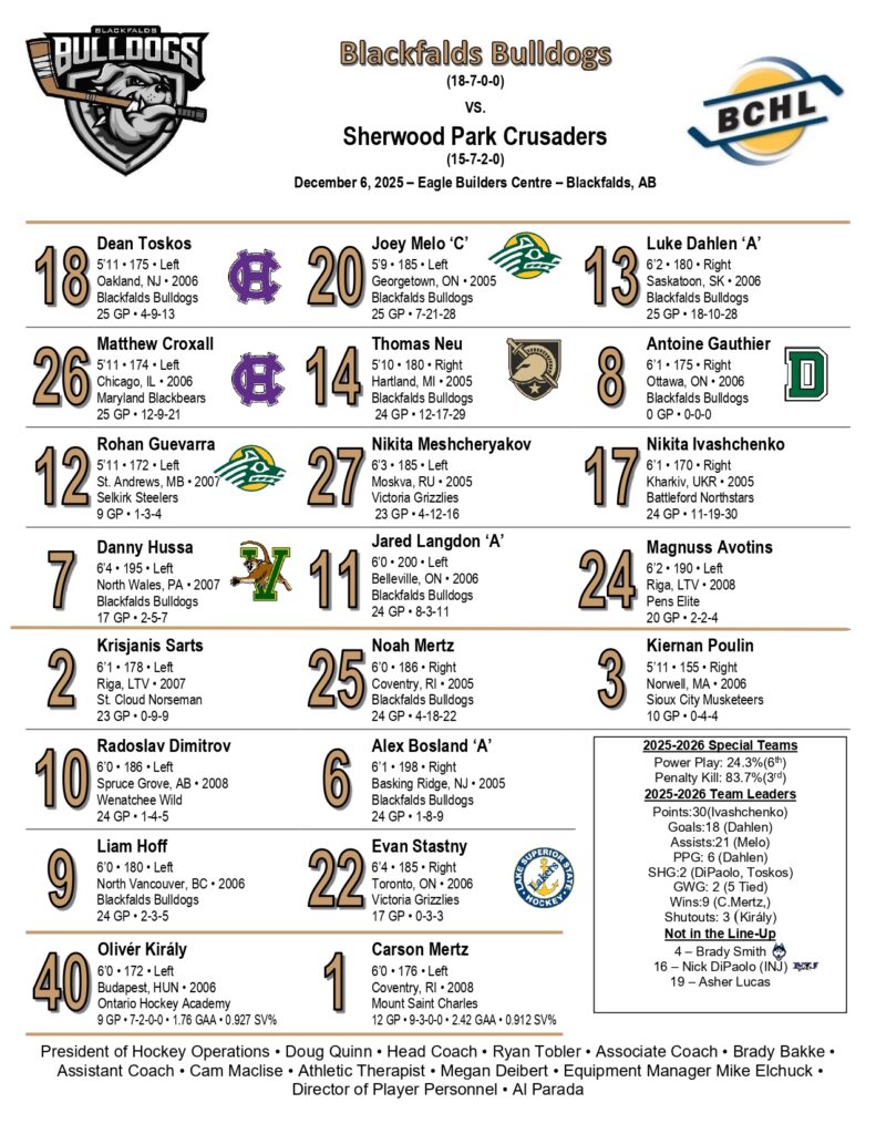 The Blackfalds Bulldogs dominated the Sherwood Park Crusaders with an 8-3 victory on Saturday night in Blackfalds. It was easily one of the strongest and most complete performances the Bulldogs have put together this season. The game got physical and chippy throughout, but after a while the frustrated Crusaders appeared to quit on the ice — with the notable exception of their goaltender, who kept battling. On the Sherwood Park bench, their coach provided unintentional entertainment, furiously yelling at his players and waving an iPad around to point out mistakes, his bald head shining under the arena lights in a way that had more than a few fans whispering, “He’s giving serious Howie Mandel vibes.” It was a bitterly cold night, and with holiday parties and holiday events all over town, attendance was down to around 500 fans. Here’s hoping the crowd bounces back bigger for Sunday’s Teddy Bear Toss game!