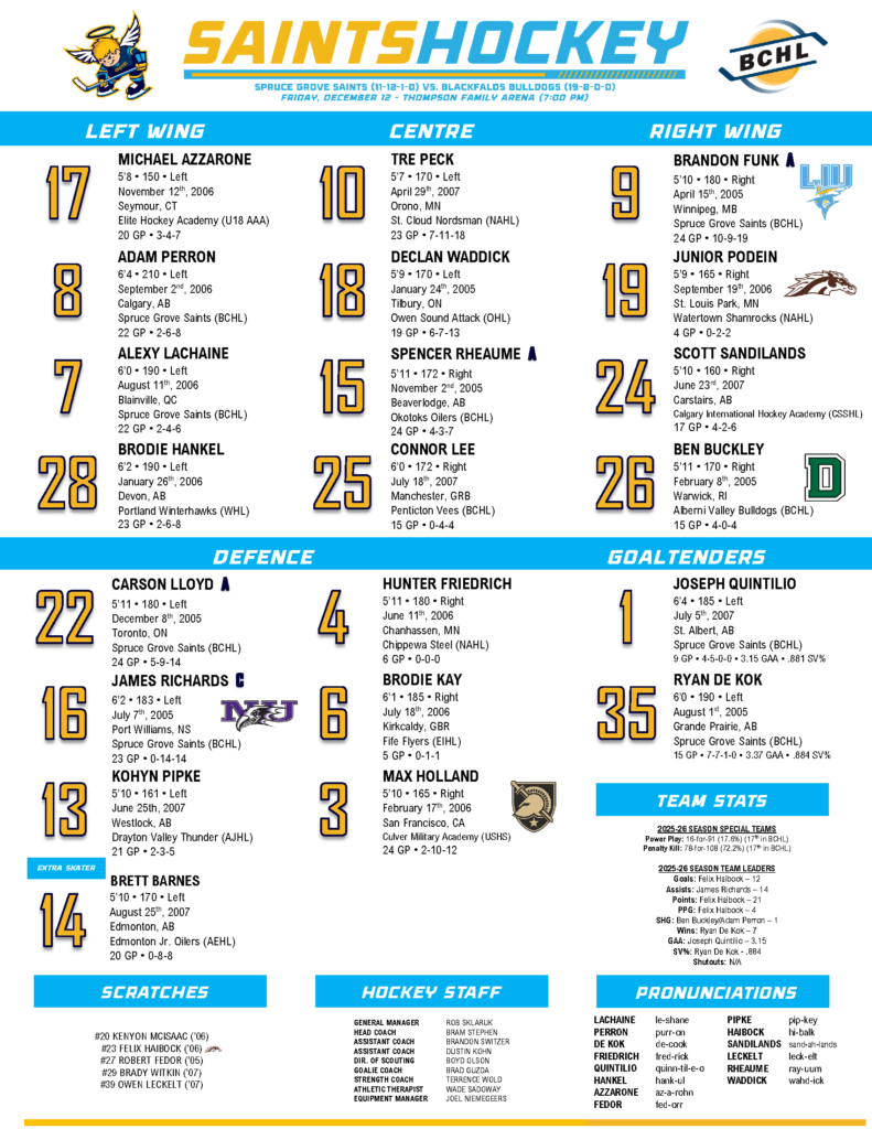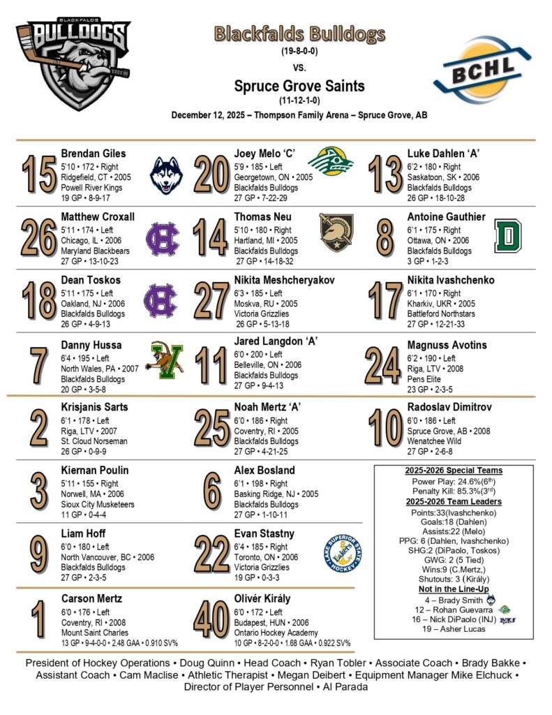 The Blackfalds Bulldogs earned a much-needed 6-3 road victory over the Spruce Grove Saints last night, bouncing back impressively from a disappointing performance the previous Sunday. teams brought strong efforts in a competitive matchup, but the Bulldogs’ sharper execution made the difference. The win provided a welcome boost for Blackfalds after a tough outing just days earlier. The evening had its share of entertainment before the puck even dropped. The Saints continue their fun tradition of bringing out “Bill Nye the Science Guy” alongside their infamous Chucky doll mascot to fire T-shirts into the crowd. That Chucky figure remains undeniably creepy—picture a Cabbage Patch Kid that’s seen a few too many late nights and hard substances. You would think it would give kids nightmares and ironically enough its a kid dressed in it. Playing in Spruce Grove’s sleek new arena also added to the atmosphere; the modern facility is a significant upgrade from the Saints’ old barn and makes for a far more enjoyable to watch. Unable to access the usual FloHockey away broadcast, I tuned into the Spruce Grove radio crew instead—and they delivered a solid, professional call throughout the game. Which is strange the option wasn’t on the TV as Stinson was obviously at the game.