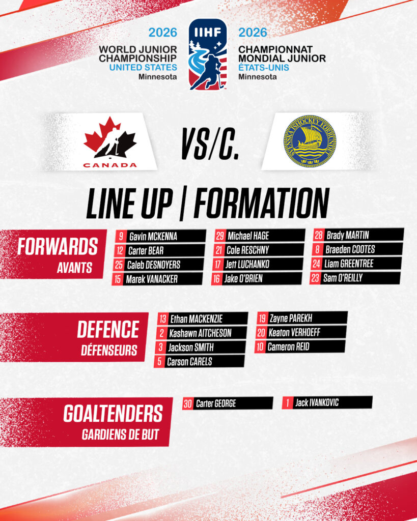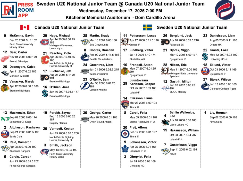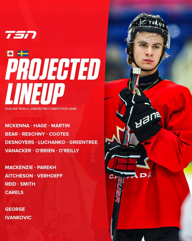 Kitchener Ontario-Brady Martin and Gavin McKenna have quickly found chemistry for Canada’s world junior team. Martin scored twice as Canada defeated Sweden 2-1 in pre-tournament action for the world junior hockey championship Wednesday. Canada has released three players from its World Junior Championship roster: forwards Marek Vanacker and Jake O’Brien, as well as defenseman Jackson Smith. On defense, the final cut appeared to come down to either Smith or Keaton Verhoeff, and while both are talented players, they were considered the relatively weaker options among the group under consideration. I was somewhat surprised that Carter Bear was retained, as I had thought he might have been a candidate to be sent home instead of either O’Brien or Vanacker. I personally would of cut Parekh🤪