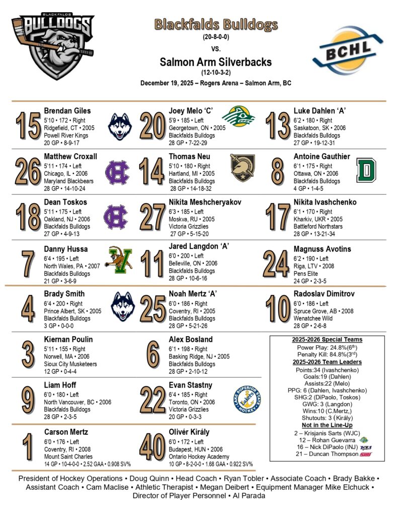 On December 19, 2025, the Salmon Arm Silverbacks hosted the Alberta division-leading Blackfalds Bulldogs at Rogers Rink. Coming off a weekend split with the West Kelowna Warriors—including a 2-0 home shutout—the Silverbacks were looking to build on their momentum against a tough opponent. The Bulldogs entered hot after a win over the Spruce Grove Saints. In a tight, physical game, Blackfalds came out on top with a 3-2 victory, thanks to timely scoring and solid goaltending on both sides. Christensen has looked great both times the Bulldogs have played against him.