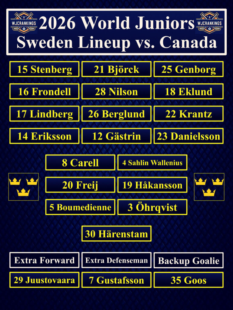 Love Harenstram made 23 saves on the 25 shots that he faced for the win for the Swedes. For the Canadians Michigan Wolverine Goalie Jack Ivankovic made 12 saves on the 14 shots that he faced.