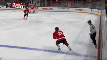 Michael Misa makes it 6-1 Canada at 4:41 of the third period. The assists on the goal went to Porter Martone and Kashawn Aitcheson.–Michael Misa got the sixth goal off a great back pass from Martone behind the Denmark goal at 4:45.
