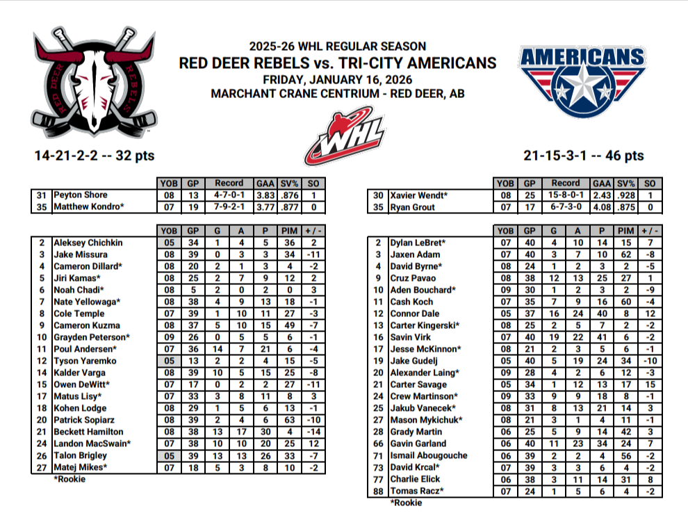 Friday night at the Marchant Crane Centrium was all about Rebels captain Talon Brigley, who made franchise history by playing his 302nd career regular-season game, breaking the old record of 301 held by Jonathan Zukiwsky. The Sylvan Lake native, who’s been with the team since debuting as a 16-year-old in 2021, got a nice pre-game ceremony with a watch from owner/GM Brent Sutter, and his parents Trina and Travis even joined him on the ice for photos. Brigley called it really special and said he owes the organization everything for how they’ve helped him grow as a player and person. Coach Marc Habscheid couldn’t say enough good things, calling him a great leader, player, and an even better guy—especially important on the league’s youngest roster full of 17-year-olds who need a solid shepherd like him. The 20-year-old forward has 26 points in 40 games this season and is headed to NCAA Division I Sacred Heart next year.Unfortunately, the milestone night ended in a tough 5-3 loss to the Tri-City Americans in their only meeting this season. The Rebels battled hard, tying it up a couple times (goals from Matus Lisy, Tyson Yaremko, and Beckett Hamilton), but Tri-City pulled away late with a power-play tally from Cruz Pavao and an empty-netter. Goalie Peyton Shore made some good saves, but Xavier Wendt was outstanding for the Americans, stopping 42 of 45 shots. Habscheid felt his team deserved better with all the chances they created. The loss drops Red Deer to 12-22-2-2 as they kick off a four-game homestand—they’re right back at it hosting Lethbridge on Saturday.