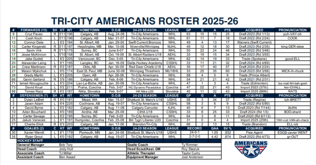 Calgary native Cruz Pavao gives the Americans the lead at 12:32 of the third period while on the Power Play. The assists on the goal went to 16 year old Olds, Alberta native Crew Martinson and Czech Import Jakub Vanecek.–The game stayed locked at 3-3 until Tri-City earned a four-on-three power play after Kalder Varga was penalized for goaltender interference during four-on-four play. Jakub Vanecek fired a shot from the point that deflected off Crew Martinson in front, allowing Pavao to quickly snap the loose puck past Shore’s blocker with 7:28 remaining in regulation to give Tri-City a 4-3 lead.