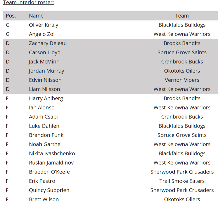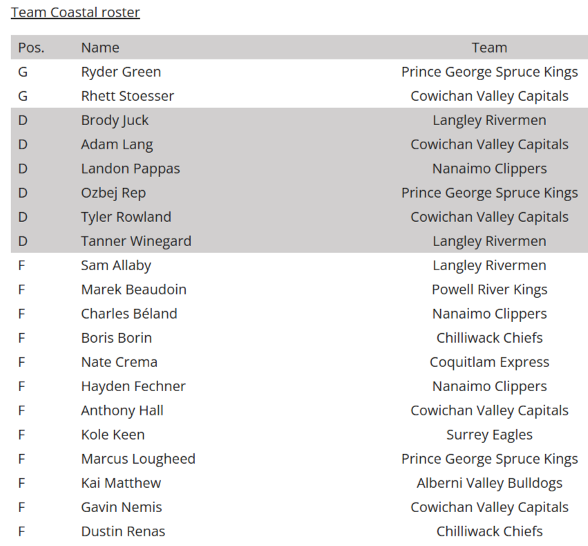 For the Interior team West Kelowna Warrior Angelo Zol made 13 saves on the 14 shots he faced. He was replaced half way through the game by Bulldog Oliver Kiraly who stopped 13 of the 15 shots that he faced. For Team Coastal Prince George Spruce King Ryder Green stopped 24 of the 29 shots he faced. The BCHL website says the game was split with Rhett Stoesser. Which it wasn’t