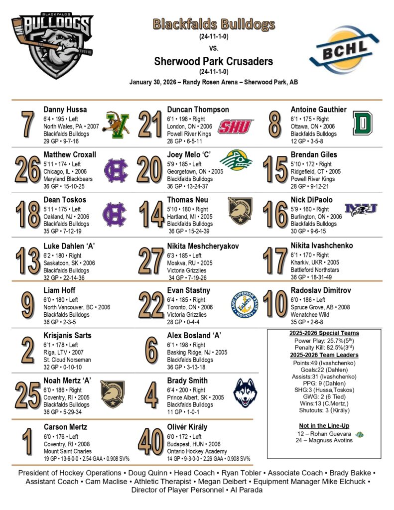 Last night, the Blackfalds Bulldogs rolled into Sherwood Park and took down the Crusaders by a convincing 4-1 score, showing why they’re a force to be reckoned with in the BCHL. Thomas Neu was absolutely electric, lighting the lamp three times for a beautiful hat trick that stole the show. In net, Carson Mertz stood tall and solid all night for the Bulldogs, turning away most of what came his way. Credit where it’s due, though—Filip Vavro battled hard in the Crusaders’ crease and kept things respectable despite the final tally. Watching on TV wasn’t without its frustrations: that protective netting at Randy Rosen Rink always seems to get in the way, cluttering the view more than it should. And apparently, the Crusaders are the only team in the league without a jumbotron in their building, which keeps the in-arena experience a bit old-school. Couldn’t pull up the Bulldogs’ stream, so I had to tune into the Crusaders’ broadcast instead—not quite the polished call you get from Stinson, but the crew gave it their all and kept the energy going.