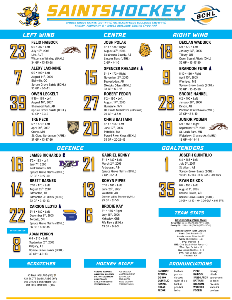 The Spruce Grove Saints edged out the Blackfalds Bulldogs 3-2 in a tightly contested BCHL matchup last night (February 6, 2026) at Eagle Builders Centre, despite being thoroughly outplayed for much of the game. The Bulldogs dominated possession and shot volume, outshooting Spruce Grove by a wide margin overall (34-21) and piling up around 30 shots through the first half of the contest before their pace cooled off in the later stages. Goaltender Joseph Quintilio was the standout for the Saints, turning aside 32 of 34 shots to steal the win and extend their streak to three games. Blackfalds struck first in the second period via Nikita Ivashchenko, but Spruce Grove answered almost immediately through Felix Haibock. The Bulldogs regained the lead early in the third on a power-play tally from Luke Dahlen, yet the Saints’ Declan Waddick notched what proved to be the game-winner later in the frame—though all three Spruce Grove goals had a somewhat fluky, opportunistic quality amid the heavy pressure. Their quick responses and a key power-play conversion ultimately made the difference in a game that stayed nail-biting until the end.