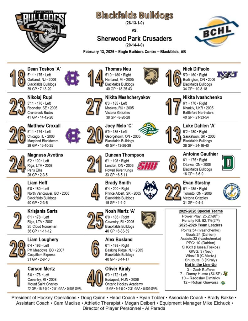 The Blackfalds Bulldogs pulled off a solid 2-0 win over the Sherwood Park Crusaders last night, snapping their own two-game skid while pushing the Crusaders’ losing streak to five. From what I saw, the Bulldogs pretty much owned the puck battles all over the ice—they were winning just about every race and board fight. Both goalies stood on their heads, but Carson Mertz stole the show for Blackfalds. He picked up his first shutout in a Bulldogs jersey (he’s come close a bunch this year), and he really earned it late when Sherwood Park turned up the heat and threw everything at him in the final minutes. He just kept slamming the door.Big night offensively too for the new guy—Nikolaj Ruppi, who came over in that recent trade with the Cranbrook Bucks for Brendan Giles, scored his first goal as a Bulldog in his debut game with the team. Nice way to introduce himself. Speaking of Giles, he was only around for a short stint but seemed like a good player and fun to watch. Hope things work out for him in Cranbrook, though word is he might not have even suited up for the Bucks last night. Who knows what’s going on there—maybe still settling in or something. Anyway, good bounce-back win for the Bulldogs. They looked sharp.