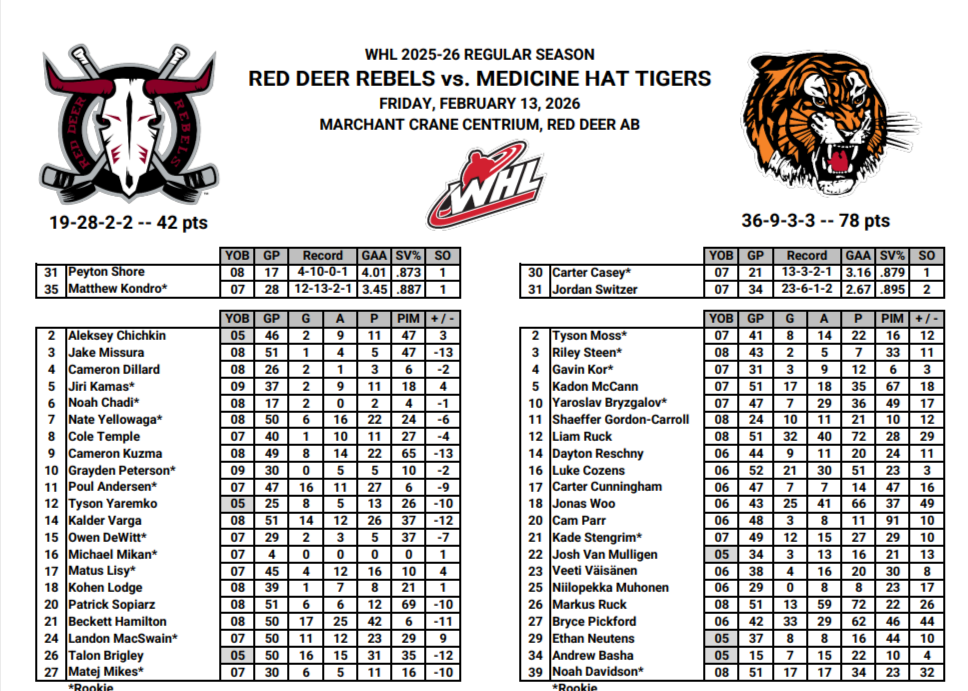 It was one of those Friday the 13th nights at the Marchant Crane Centrium where the Medicine Hat Tigers came to haunt the Red Deer Rebels—but in the end, it was 18-year-old goaltender Matthew Kondro who turned the tables and did the haunting. The Tigers bombarded the net with 58 shots, yet Kondro stood tall with a staggering 54 saves, delivering what many are calling one of the most sensational goaltending performances ever seen in that building. On any other night, Beckett Hamilton’s four-point explosion (two goals, two assists) would have owned the headlines, but Kondro was the undisputed star, earning every bit of top honors as the Rebels escaped with a thrilling 5-4 overtime victory. Poul Andersen delivered the winner in the extra frame, while Talon Brigley and Nate Yellowaga also found the back of the net to keep Red Deer alive. The Rebels converted two of their four power-play chances and blanked the Tigers on both of theirs, despite being outshot so heavily.The win improves Red Deer to 20-28-2-2, keeping them one point ahead of Regina for eighth in the WHL Eastern Conference and just one back of Moose Jaw for seventh. Medicine Hat, now 36-9-4-3, dropped their fourth overtime loss of the season and couldn’t quite finish the comeback after erasing three one-goal deficits to force the extra period.Head coach Marc Habscheid was quick to give credit where it was due. “Sometimes your goalie’s got to play, and he played tonight and got the win,” he said afterward. “On the other side, our guys gutted it out and found a way. [Kondro’s] played okay for us this year, and sometimes during the season you’re not going to have your game—and we didn’t. We tried different lines, systems, you name it. I’ll take the blame for that. We needed our goalie to come through, and he did. ”Hamilton has been on fire lately with points in five straight (and 14 of his last 16), while Brigley (five straight), Andersen (four straight), and Yellowaga (nine of 11) are all heating up too. A crowd of 4,035 witnessed the drama, and for one night at least, the young netminder was the sheriff in town.