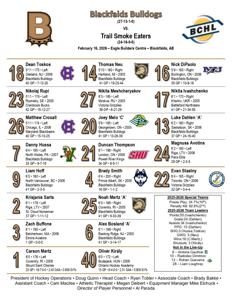 The Blackfalds Bulldogs delivered a commanding performance yesterday at the Eagle Builders Centre, defeating the visiting Trail Smoke Eaters by a decisive 5-2 score in BCHL action. The hometown squad shook off the visitors’ earlier-season success against them—where Trail had taken both prior meetings—and flipped the script with a balanced attack and strong defensive effort in front of an enthusiastic local crowd. Goals came from key contributors including standout forward Nick DiPaolo, who earned second-star honors, as the Bulldogs built momentum through the periods to secure the victory and improve their strong position atop the Interior East division. Assistant Coach Cam Maclise praised the team’s execution post-game, highlighting the collective grit that propelled Blackfalds to overcome a talented Trail side. With this win, the Bulldogs showed why they’re a force to be reckoned with this season, sending fans home happy after a gritty, well-earned triumph over the Smoke Eaters. Also with Trail coming to town marks the return of Smoke Eater super girl fan Big Ethel at the game cheering her beloved Smoke Eaters on. She wasn’t as loud and or as annoying this game as there was not much to cheer for.
