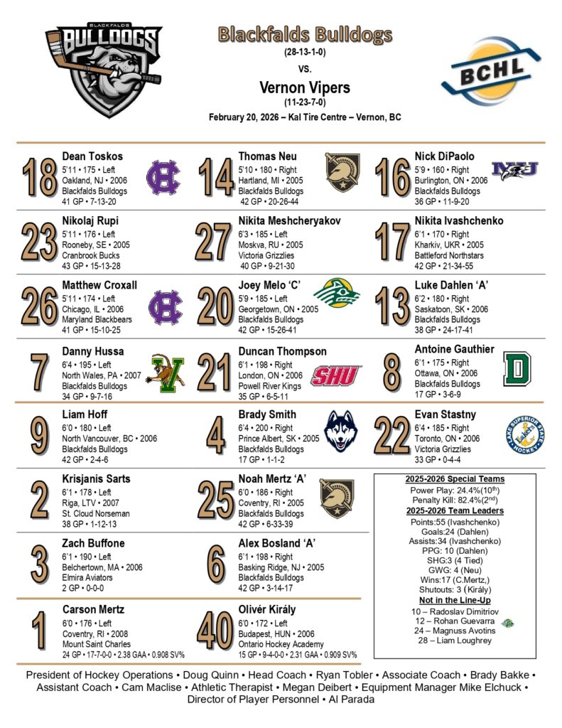 The boys from Blackfalds showed once again why they’re the class of the Interior East last night, grinding out a hard-fought 4-1 road victory over the Vernon Vipers at Kal Tire Place on February 20. The Bulldogs came in with a solid game plan, staying patient through a tight-checking first two periods where Vernon actually snuck ahead 1-0 on Shawn Leary’s goal in the second. But the third period belonged to Blackfalds—discipline problems for the Vipers opened the door, and the power play clicked like it has all season. Nikita Ivashchenko tied it up on a 5-on-3, then Luke Dahlen buried a backdoor feed from Thomas Neu to take the lead. Dean Toskos added a nice even-strength tally, and Ivashchenko capped his two-goal night with another man-advantage marker to seal the deal. The shots told the story at 39-21 for the Bulldogs, and special teams were the difference—the guys went 3-for-8 with the extra man while Vernon couldn’t convert on their chances. What makes this one extra sweet for Bulldogs fans is that the win officially punched our ticket to the Rogers BCHL playoffs. With the point total now locked in and the standings showing us comfortably positioned (sitting strong at 29-13-1-0 after the result), the postseason berth is secured—no more waiting, no what-ifs. The team’s been building toward this all year, and clinching it on the road against a scrappy Vernon squad just feels right. Next up, the boys head home to keep pushing for that top spot in the division—proud day to be from Blackfalds.