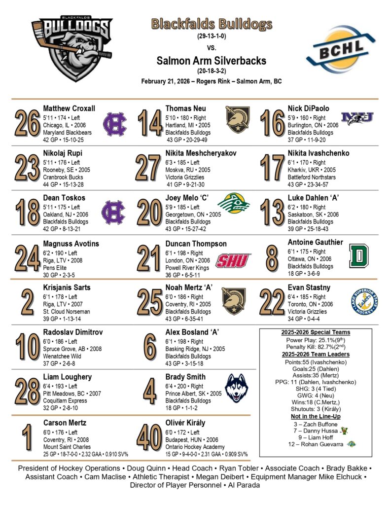 The Blackfalds Bulldogs came out firing on the road last night, taking down the Salmon Arm Silverbacks 7-4 in a wild, goal-filled BCHL clash at Rogers Rink. The Bulldogs jumped ahead early with a couple in the first period, including Nikita Ivashchenko’s 24th of the season assisted by Liam Loughery around the four-minute mark, while the Silverbacks answered back once through Keifer Miller (his 10th, set up by Cooper Conway) to make it 2-1 after one. Blackfalds really took control in the second with three more tallies to build a commanding lead, then held off a late Salmon Arm push in the third where the home side managed three goals but couldn’t close the gap. It was a high-energy, back-and-forth night with plenty of offense on display, and the Bulldogs’ finishing touch proved the difference as they skated away with the solid road win.