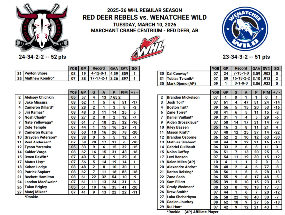 The Red Deer Rebels dropped a heartbreaker 5-4 in overtime to the Wenatchee Wild on Tuesday night at the Centrium in their only meeting this season. It stayed quiet through two periods, but the third exploded with three goals each way to force the extra frame and lock in a point for the home side. Rookie Mason Kraft had a big night for Wenatchee with two goals, including the winner just 1:46 into OT, while Kohen Lodge stepped up for Red Deer with his first career two-goal game. Coach Marc Habscheid admitted afterward it was a tough one against a hard-working Wild team that lived up to expectations, saying they probably didn’t earn two points but were happy to grab one—it keeps them two points ahead of the Moose Jaw Warriors for that eighth and final Eastern Conference playoff spot at 53 points through 63 games (24-34-3-2). They’re just three back of the Regina Pats in seventh, with five left to play. The schedule doesn’t get any easier though, as the Rebels still have two more cracks at the strong Medicine Hat Tigers, while Moose Jaw draws some softer ones against bottom-feeder Swift Current three times plus Regina once. Defenseman Aleksey Chichkin got banged up late in the second after hitting the boards and didn’t return, and the Rebels are now 0-3 all-time against Wenatchee since they moved from Winnipeg. Big point in the race, but they’ll need to dig deep down the stretch to hang onto their spot.