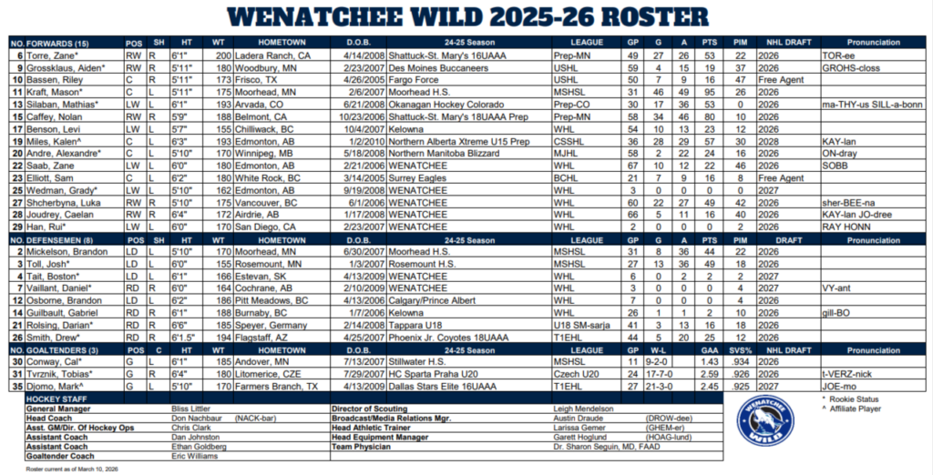Former Rebel Zane Torre ties the game back up for the Wild at 5:41 of the third period. The assist on the goal went to 2024 1st round 12th overall pick Boston Tait.–Just four minutes after that, Wenatchee answered right back to knot things up once more when ex-Rebel Zane Torre tipped a shot from the point past Kondro.
