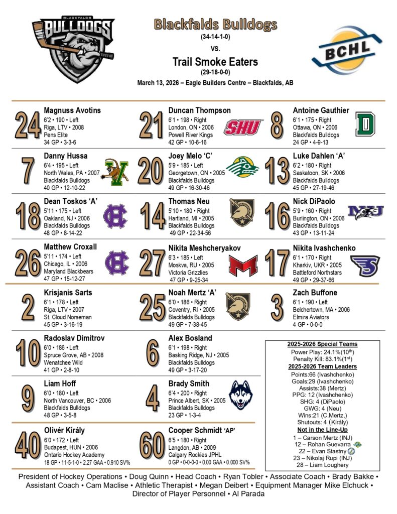 On the injury front, the team hasn’t shared much detail publicly (as usual), so it’s unclear how long forwards Nikolaj Rupi and Carson Mertz will be sidelined. With Mertz out, the Bulldogs brought up backup goalie Cooper Schmidt—a Langdon, Alberta product who’s been suiting up for the Calgary Rockies in the JPHL. Honestly, the Bulldogs looked in control for most of the night. They won the majority of puck battles, outskated Trail consistently, and created plenty of chances. They probably could have padded the scoreline more if not for some standout goaltending from the Smoke Eaters’ netminder, former Spokane Chief Cooper Michaluk. He was lights-out and, in a losing cause, easily could have been named first star of the game. Credit where it’s due—he kept his team in it. A hard-fought two points for Blackfalds as they keep pushing for that division lead.
