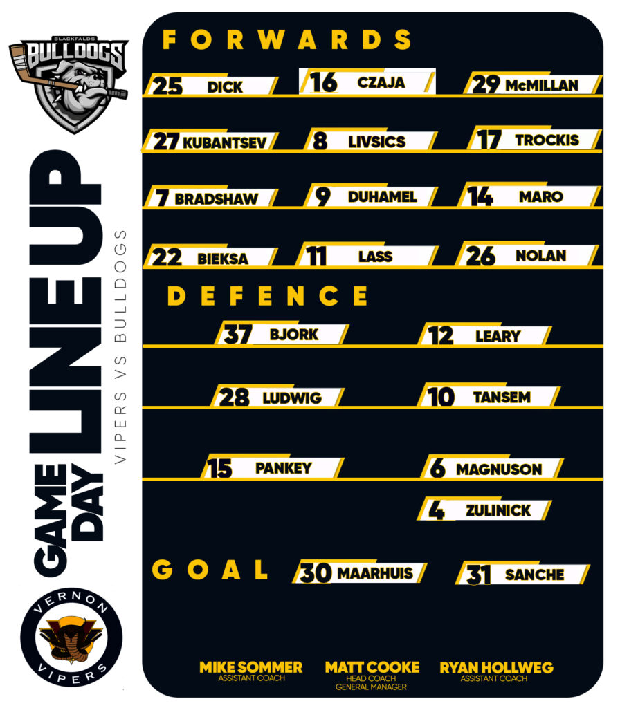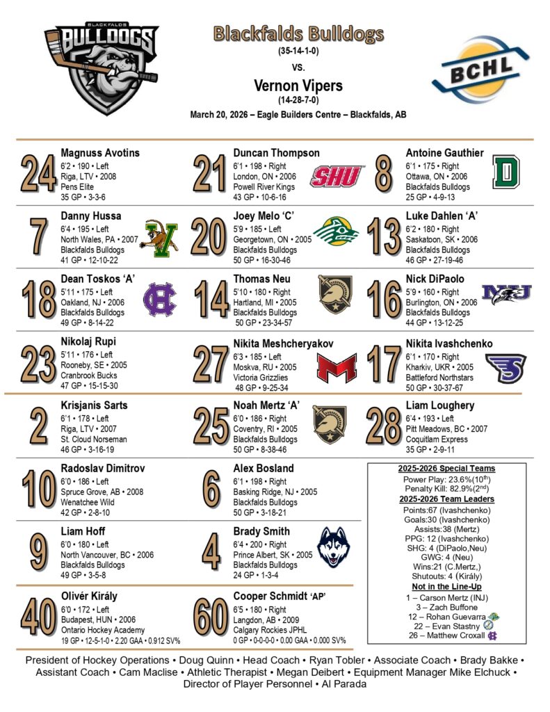 Simply put, this was supposed to be a must-win for the Vernon Vipers with the Cranbrook Bucks idle, but instead it turned into the night their playoff dreams officially died. Trailing by eight points and needing to sweep their final games while navigating tough tiebreakers, the Vipers came out flat against the Blackfalds Bulldogs and suffered a 6-3 loss Friday night that eliminated them from contention, dropping their record to 14-29-7-0 and locking them into last place in the Interior West Division while Cranbrook locked up the final spot. The Bulldogs, battling the Brooks Bandits for top spot in the Interior East with the tiebreaker in their favor, got off to a strong start and never looked back, thanks in large part to two penalty-shot goals—Antoine Gauthier converting one midway through the first to make it 2-0 and Nick DiPaolo adding another in the third to push the lead back to three after Vernon had narrowed the gap with a late push. It was a rare feat too; after checking around, it doesn’t look like two penalty shot goals have been scored in the same BCHL game before, or at least not often enough to pop up in any records or recaps I’ve seen. Vernon showed some fight late with goals from Toms Trockis, Connor Dick, and Dario Lass, but the early hole was too deep, and now with just three games left, it’s all about finishing the season strong. Tough pill to swallow for the Vipers fans, sounds familiar to Bulldog fans. This is the second year in a row for the Vipers of missing the playoffs.
