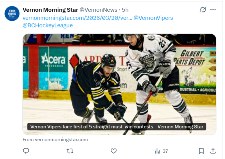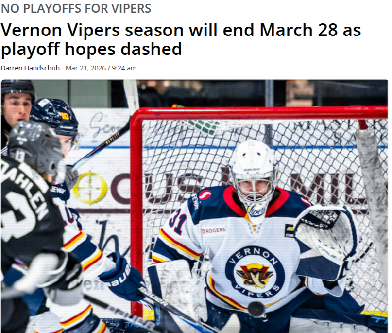 Yeah, with the Vernon Vipers getting knocked out of the 2025-26 playoffs after that loss to Blackfalds, it marks their second straight season missing the postseason. They were already eliminated back in March 2025 during the 2024-25 campaign—finished well out of the running in the Interior Conference (or West division setup) with a rough record around 15-33-6 or so, and articles from that time called it a disappointing year where they couldn’t close the gap on the playoff spots. Before that, though, they had been pretty consistent about making it in; reports mention the last time prior to 2024-25 that they missed was way back in 2013, so this current two-year drought is the first time in over a decade they’ve been on the outside looking in for back-to-back seasons. Tough stretch for a franchise with such a loaded history of deep runs and championships earlier on, but hopefully they can turn it around soon with the young talent and whatever changes are coming. Fans have to be itching for a return to form.