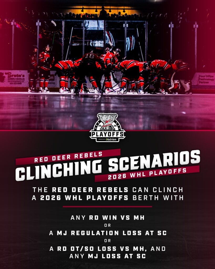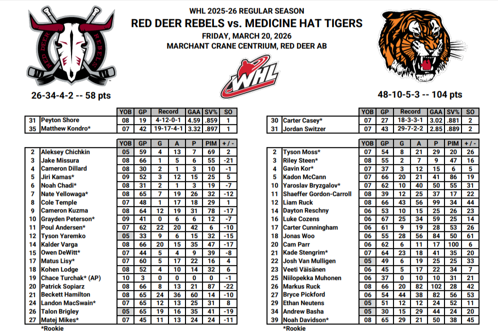 The chase for the final playoff spot in the WHL’s Eastern Conference is coming right down to the wire, with the Red Deer Rebels holding on by the slimmest of margins after a tough 9-3 home loss to the Medicine Hat Tigers on Friday night in front of 5,549 fans at the Centrium. Forward Poul Andersen tried to keep things close by netting a pair of goals for Red Deer, but Yaroslav Bryzgalov powered the Tigers with a hat trick and three goals overall as Medicine Hat poured it on. Head coach Marc Habscheid didn’t mince words afterward, pointing out that his team handed the Tigers way too many prime scoring chances. That defeat, combined with the Moose Jaw Warriors’ win over the Swift Current Broncos, leaves the Rebels sitting in eighth place with 58 points—just one ahead of the ninth-place Warriors (57 points) and one behind the seventh-place Regina Pats (59 points), who couldn’t lock up their spot after dropping a game to the Brandon Wheat Kings. With each squad down to their final regular-season game on Saturday, the Rebels’ fate is largely in their own hands: a win on the road against the Tigers would clinch it outright and get them back in the postseason after missing last year. Even if they fall short, they could still sneak in if the Warriors drop their home game to Swift Current in regulation. There are also a few tiebreaker scenarios floating around where Red Deer and Moose Jaw could end up facing off in a play-in game to settle it. It’s win-and-in pressure for the Rebels, but at least they control their destiny heading into the finale.