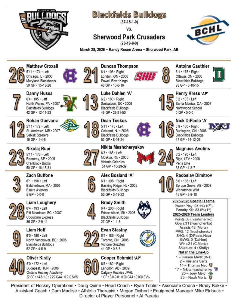 The Blackfalds Bulldogs dropped a 4-3 overtime decision to the Sherwood Park Crusaders on Saturday night at Sherwood Park Arena, a result that felt more strategic than competitive in the end. With playoffs looming, Blackfalds sat out most of their top players, clearly prioritizing rest and preservation over a late-season road game—a move that makes plenty of sense for a team sitting comfortably in second place. At the same time, it handed the Crusaders a much-needed boost of confidence right when they probably had very little left after falling in overtime to the Okotoks Oilers the night before. Sherwood Park came out looking like they were in a Game 7 fight for their playoff lives, skating hard and battling every shift, while the Bulldogs glided through the contest like it was nothing more than a leisurely fun skate. The game itself lacked real spark or intensity through regulation, staying tight at 3-3 after a back-and-forth first period and a quieter second and third, before Ryan White cashed in early in OT for the hosts. Whether this “let-them-win” vibe comes back to bite Blackfalds down the line remains to be seen, but giving a hungry lower-seeded team like Sherwood Park some late momentum heading into the postseason could prove more costly than expected.