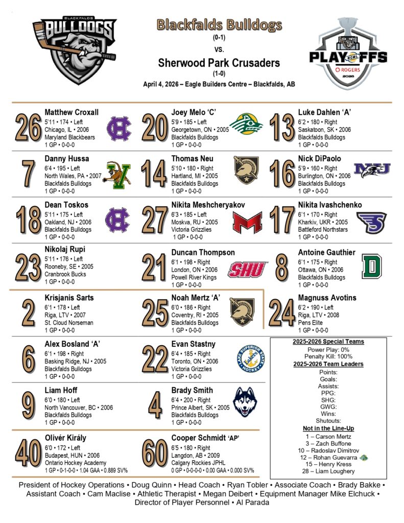The Blackfalds Bulldogs bounced back strong in Game 2 of their Rogers BCHL playoff series, blanking the Sherwood Park Crusaders 4-0 on Saturday, April 4, 2026, at the Eagle Builders Centre. The win evened the best-of-seven matchup at 1-1 after the Crusaders had taken a tight 1-0 victory in the series opener the night before. Blackfalds jumped out quickly with three goals in the first period and added another in the second, while goaltender Olivér Király stood tall with a 29-save shutout to earn first-star honors.