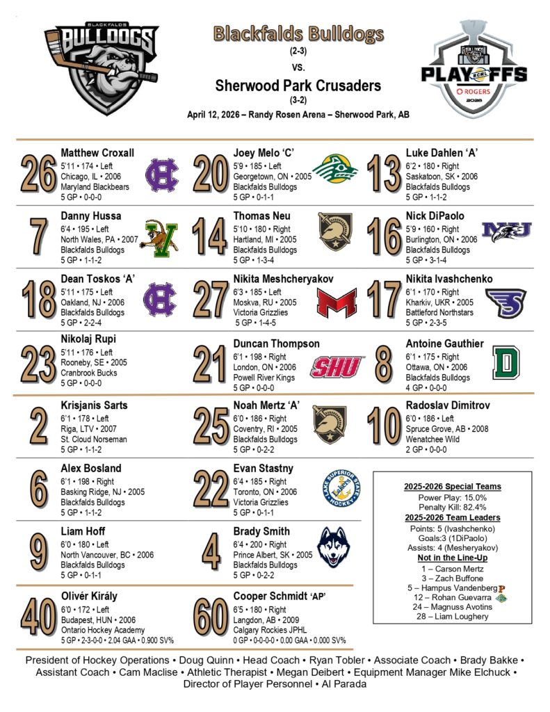 The Blackfalds Bulldogs’ promising 2025/26 season came to a disappointing end on April 12, as they fell 5-3 to the Sherwood Park Crusaders in Game 6 of their BCHL first-round playoff series, dropping the best-of-seven matchup 4-2. Despite dominating the regular-season head-to-head with a 5-1-1 record, the second-seeded Bulldogs couldn’t overcome the third-seeded Crusaders, who now advance to face the Brooks Bandits in round two. In the finale, captain Joey Melo and Matthew Croxall each tallied a goal and an assist, Nikita Meshcheryakov added a goal, and defenceman Luke Dahlen chipped in with two helpers, but goaltender Oliver Kiraly faced a tough night, allowing four goals on just 20 shots. Head coach Ryan Tobler expressed pride in his group’s effort, noting, “I thought we’d be playing more hockey, but unfortunately, that’s how this game goes.”It was nonetheless a successful campaign overall for Blackfalds, who led the BCHL with a stellar +84 goal differential, surrendered the second-fewest goals (135), and ranked fifth in scoring (219). The team showed strong chemistry and commitment from day one, battling neck-and-neck with the Bandits for the Interior East title before a late surge by Brooks edged them out. A major blow came early when one of the starting goalies, Carson Mertz went down, though Kiraly stepped up admirably. The loss marked the end of the road for several key contributors, including Braydan Smith, Alex Bosland, Thomas Neu, Nikita Ivashchenko, Nikolaj Rupi, Noah Mertz, Nikita Meshcheryakov, and captain Joey Melo—an emotional farewell for a leadership core that Tobler praised as outstanding teammates, role models, and community ambassadors. On a brighter note, star forward Ivashchenko earned a spot as a finalist for the Vern Dye Memorial Trophy as league MVP after tying for third in goals (31 in 53 games), finishing fourth in points (69), and dominating on the power play. With the core moving on, the Bulldogs are already shifting focus to the offseason and building toward their ultimate goal of winning it all next year.