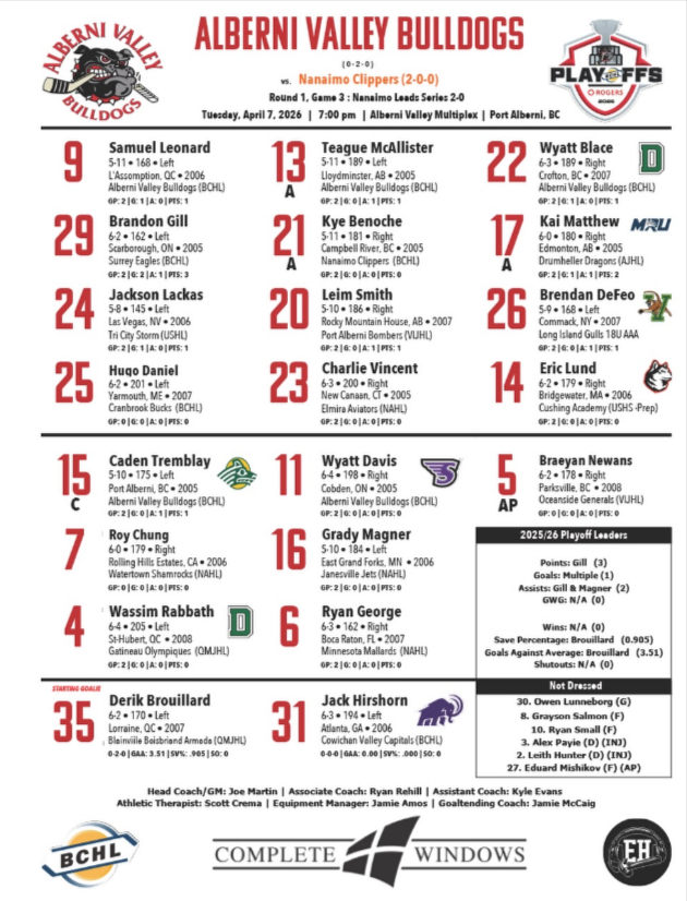 Alberni Valley Bulldogs 2026 Playoff Game Day Rosters
